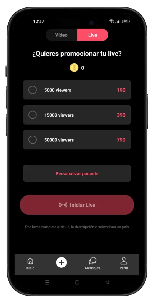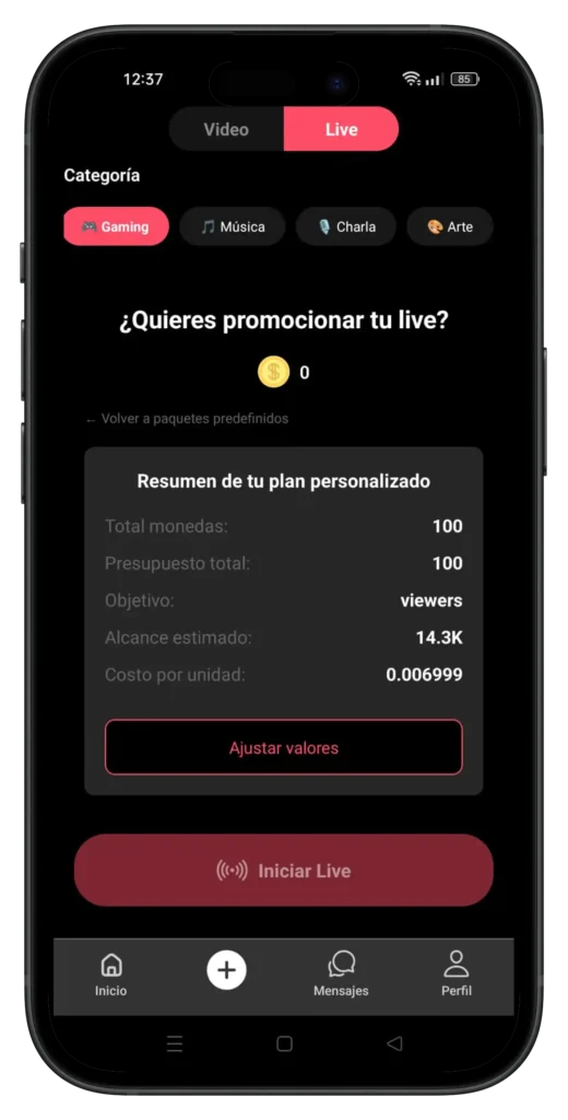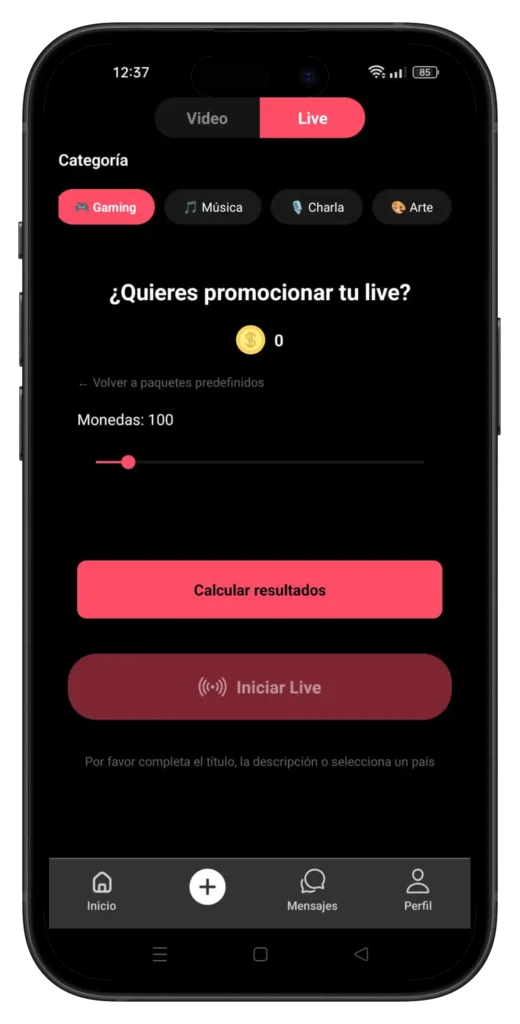 - El usuario define cuántas monedas desea invertir en la promoción de su live.